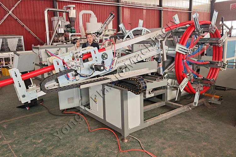 2025 में, हमने एक अग्रणी अर्जेंटीना प्लास्टिक प्रसंस्करण उद्यम को स्वचालित पीई पाइप वाइंडिंग मशीनों के दो अनुकूलित सेट सफलतापूर्वक वितरित किए। क्लाइंट को अपनी नई विस्तारित उच्च गति पीई पाइप एक्सट्रूज़न लाइनों से मेल खाने के लिए उच्च दक्षता वाले वाइंडिंग समाधान की आवश्यकता थी। ऑर्डर में दो विशेष इकाइयाँ शामिल थीं: एक डबल-स्टेशन स्वचालित वाइंडिंग मशीन जो 15-32 मिमी व्यास पाइपों के लिए अनुकूलित थी, और दूसरा उच्च क्षमता वाला मॉडल 20-63 मिमी व्यास के लिए डिज़ाइन किया गया था। ये मशीनें उच्च गति वाली पीई पाइप एक्सट्रूज़न लाइनों के साथ निर्बाध रूप से एकीकृत होती हैं ताकि पाइपों को स्वचालित रूप से एक समान रोल में घुमाया जा सके। ऑटो-लेंथ काउंटिंग सिस्टम से सुसज्जित, मशीन लक्ष्य लंबाई तक पहुंचने के बाद स्वचालित कटिंग और स्टेशन ट्रांसफर को ट्रिगर करती है। यह एक साथ तैयार रोल को सुरक्षित करता है और पैकिंग के लिए अलार्म सक्रिय करता है, जो पूरी तरह से स्वचालित वाइंडिंग समाधान प्रदान करता है। शिपमेंट से पहले कठोर फैक्ट्री परीक्षण ने डिलीवरी के बाद साइट पर स्थिर संचालन सुनिश्चित किया।
